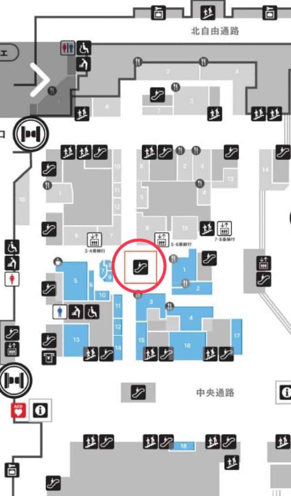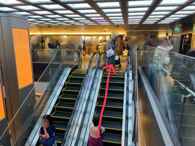 エスカレーターを上がると、中央通路・吹き抜けエリアの間に到着します。
