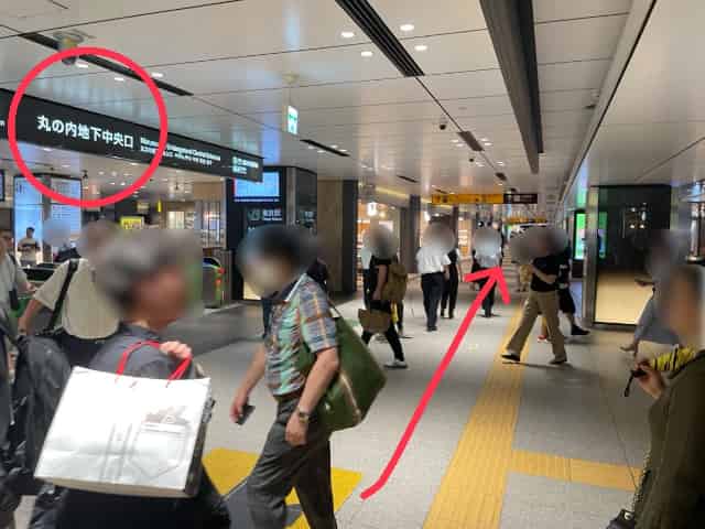 右に丸の内中央改札がある広場に出ます。矢印方向に進むと地下中央通路があります。